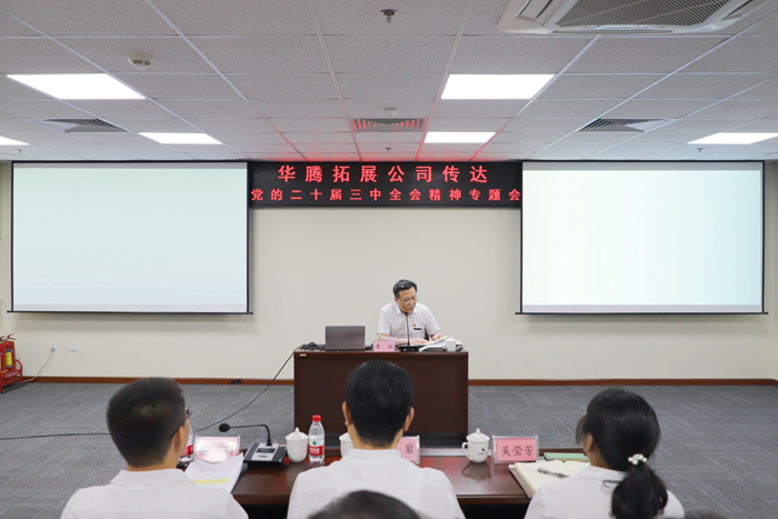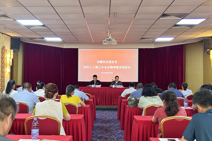 8月5日,华腾东光党总支召开学习贯彻党的二十届三中全会精神专题宣讲报告会,党总支书记、董事长、总经理宋钢作宣讲报告。